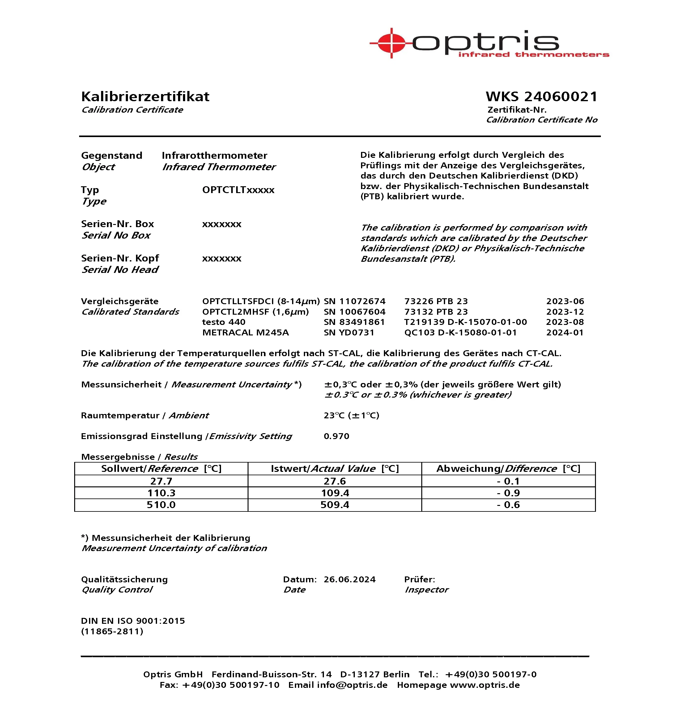 校准证书是由校准实验室或制造商提供的官方文件,用于根据公认标准验证测温仪的精度和性能。该证书包括测温仪的型号和序列号、校准日期以及测试的具体测量值和公差等详细信息。它可确保测温仪符合行业标准和规范,提供国家或国际测量标准的可追溯性。支持欧洲 PTB 标准或 NIST 标准。此外,它还包括校准程序、校准期间的环境条件以及执行校准的技术人员证书等信息。由此类证书记录的定期校准对于保持测量精度、确保符合监管要求以及支持各行业的质量控制流程至关重要。
