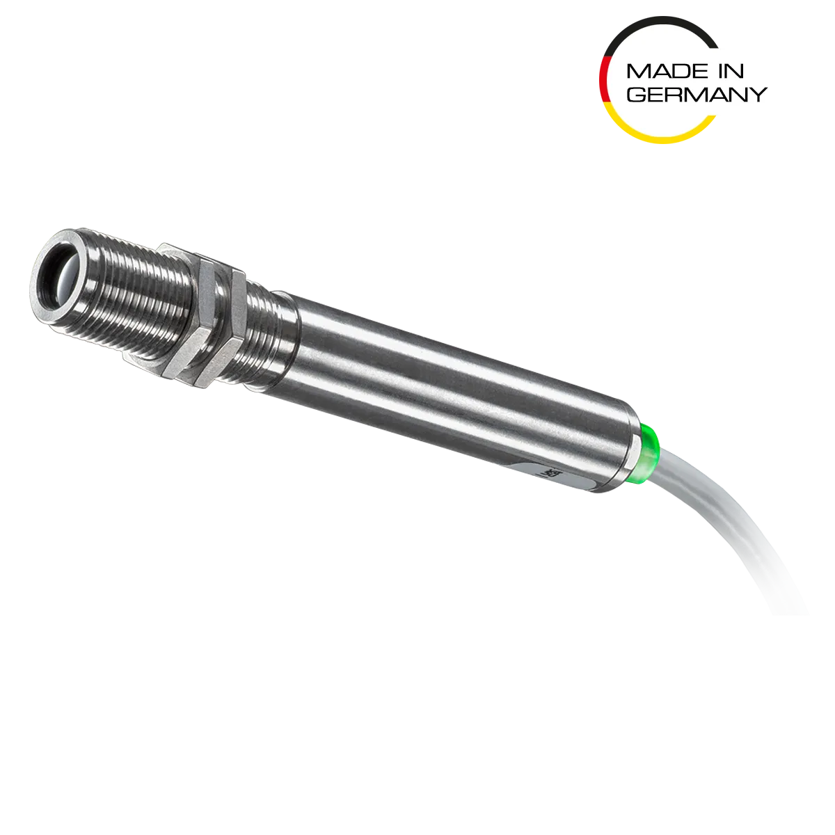 CS LT 测温仪因其低价和易用性脱颖而出,使得该红外传感器成为传统接触式温度传感器的热门替代品。独特的抗热冲击设计确保在挑战性条件下也能进行可靠的测量,与其他低预算传感器不同。这款坚固的不锈钢测量头具有M12x1螺纹,易于安装在高温狭小空间内,无需额外冷却,最高可耐80°C。紧凑的传感头长度仅85毫米,直径12毫米。此外,传感器背面的LED灯作为视觉报警或错误指示,增强了其功能性和可靠性。