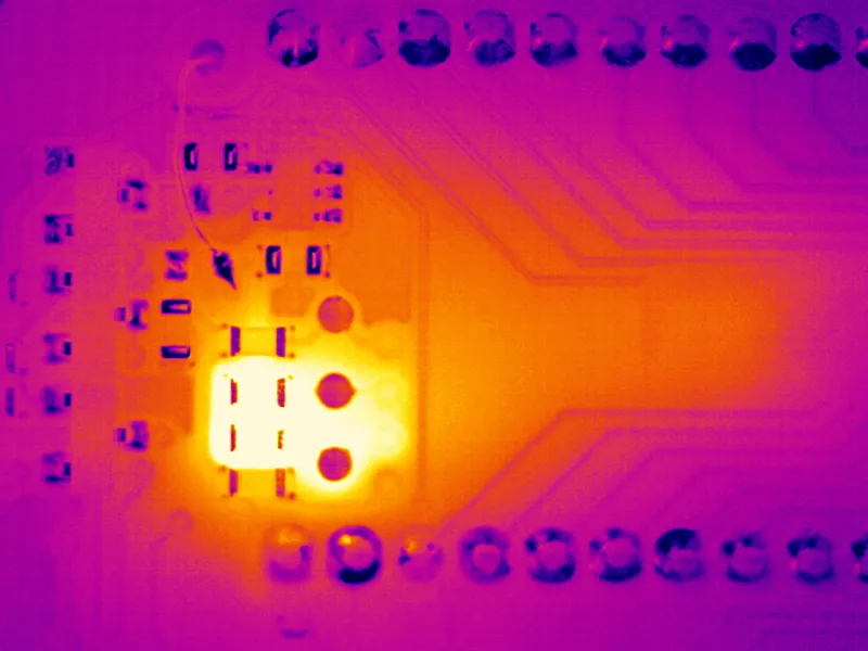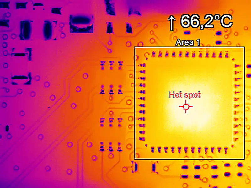 许多工程师发现,在小型电子设备上使用接触式热电偶进行的温度测量与使用配备适当的红外热像仪进行的测量结果不一致。当目标尺寸较小时,这种差异很常见,因为与热电偶的连接会成为热桥,将热量从目标传导出去。在这种情况下,使用非接触式红外热像仪进行测量更为精确,因为它们避免了接触式方法所带来的热传导问题。