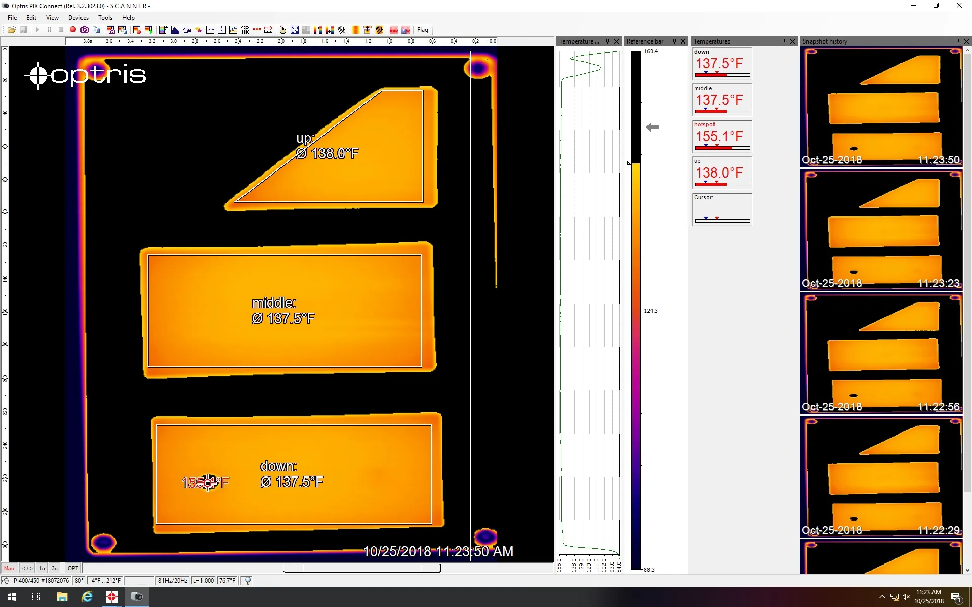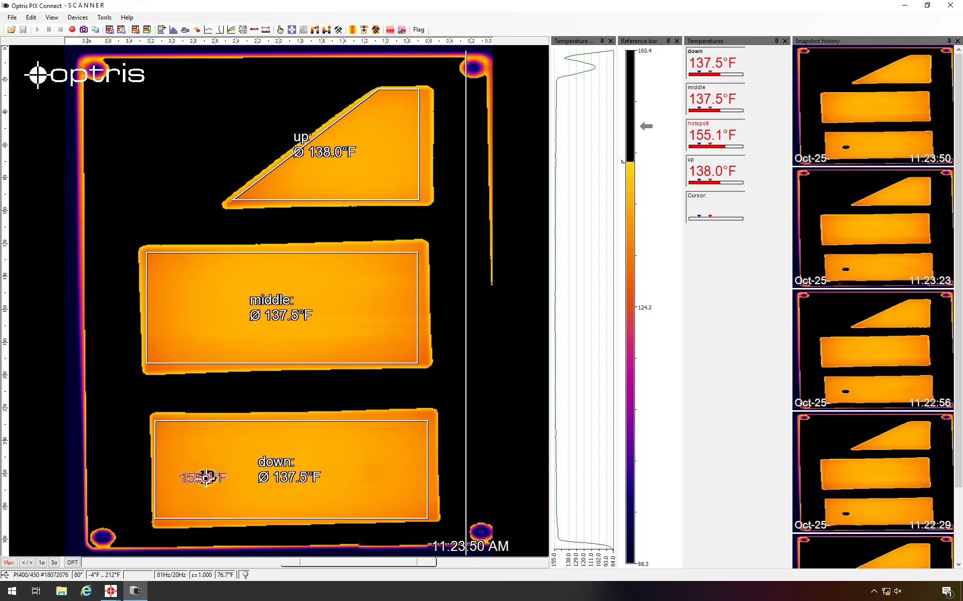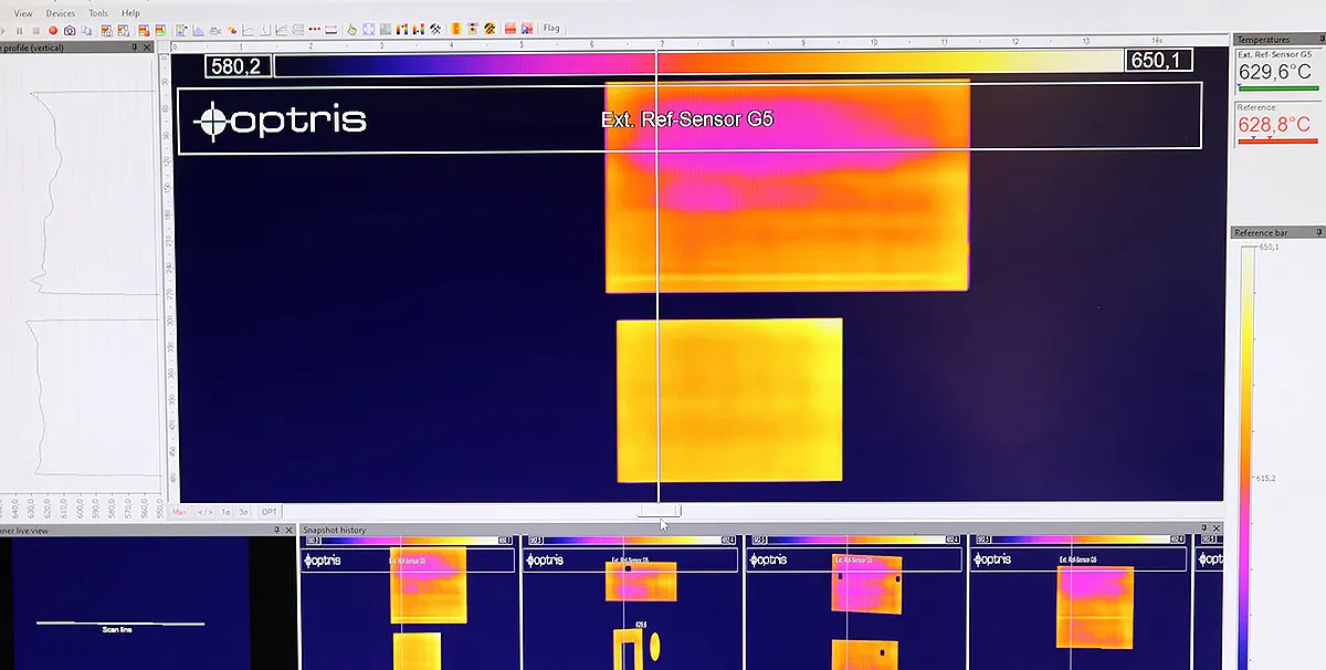 玻璃系统从炉子获取信号;信号打开两个快门,实际过程开始。软件开始线扫描并逐行构建图像。最终,创建完整的产品图像并自动保存为快照。由于每个像素都保存为温度值,因此可以随后进行精确的分析。除了保持正确的温度外,软件还将温度分布显示为轮廓。在这里,可以准确地看到玻璃上的温度分布有多好,并且可以轻松检测到不均匀性。